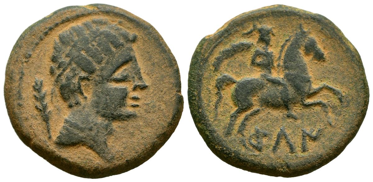 GILI (Gilet, Valencia). As. (Ae. 11,74g/26 mm). 120-20 aC (FAB-1388). Anv: Cabeza masculina con diadema a la derecha, detrás espiga. Rev: Jinete con palma a la derecha, debajo leyenda ibérica en línea: GiLI. MBC.