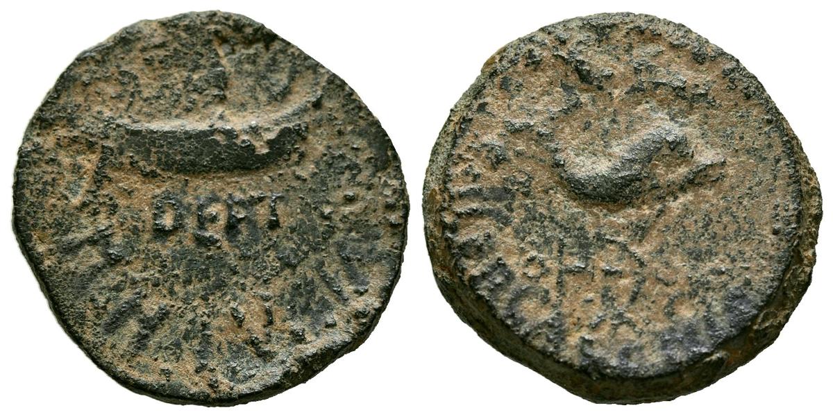 ILERGAVONIA (Tortosa, Tarragona). Semis. (Ae. 4,26g/19mm). 14-36 d.C. (FAB-1495). Anv: Nave a derecha, debajo leyenda: DERT M H IVL. Rev: Delfín entre timón y ancla, debajo leyenda: ILERGAVONIA. BC+. Muy raro.