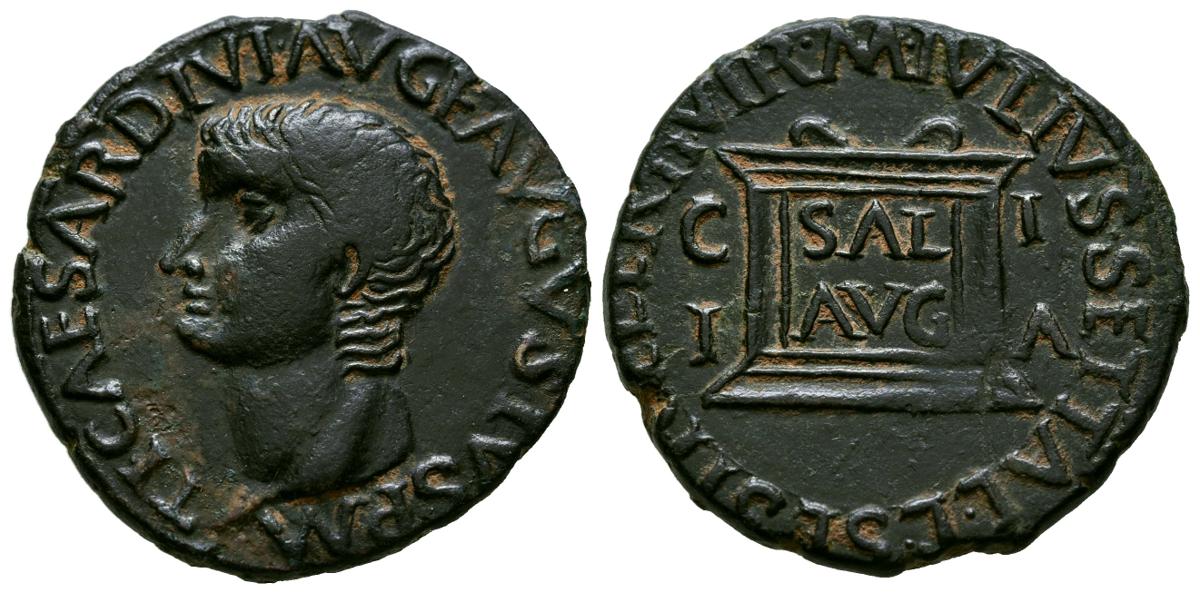 ILICI (Elche, Alicante). As. (Ae. 11,33g/28mm). 14-36 d.C. (FAB-1522). Anv: Cabeza de Tiberio a izquierda, alrededor leyenda: TI CAESAR DIVI AVG F AVGVSTVS P M. Rev: Ara con inscripción: SAL AVG, a ambos lados: C-I/I-A, alrededor leyenda: M IVLIVS SETTAL L SESTI CELER II VIR. MBC+. Campos ligeramente rebajados. Escaso ejemplar.Las acuñaciones de esta ceca de origen contestana se reducen a ases y sémises de métrica romana y exclusivamente de la época de Augusto y Tiberio. Aunque de menor volumen y con muchos menos tipos, son acuñaciones muy paralelas a las de Cartagonova. Es muy característica la representación en los reversos de un templo tetrástilo dedicado a la diosa Juno, asimilación romana de la Tanit Cartaginesa.