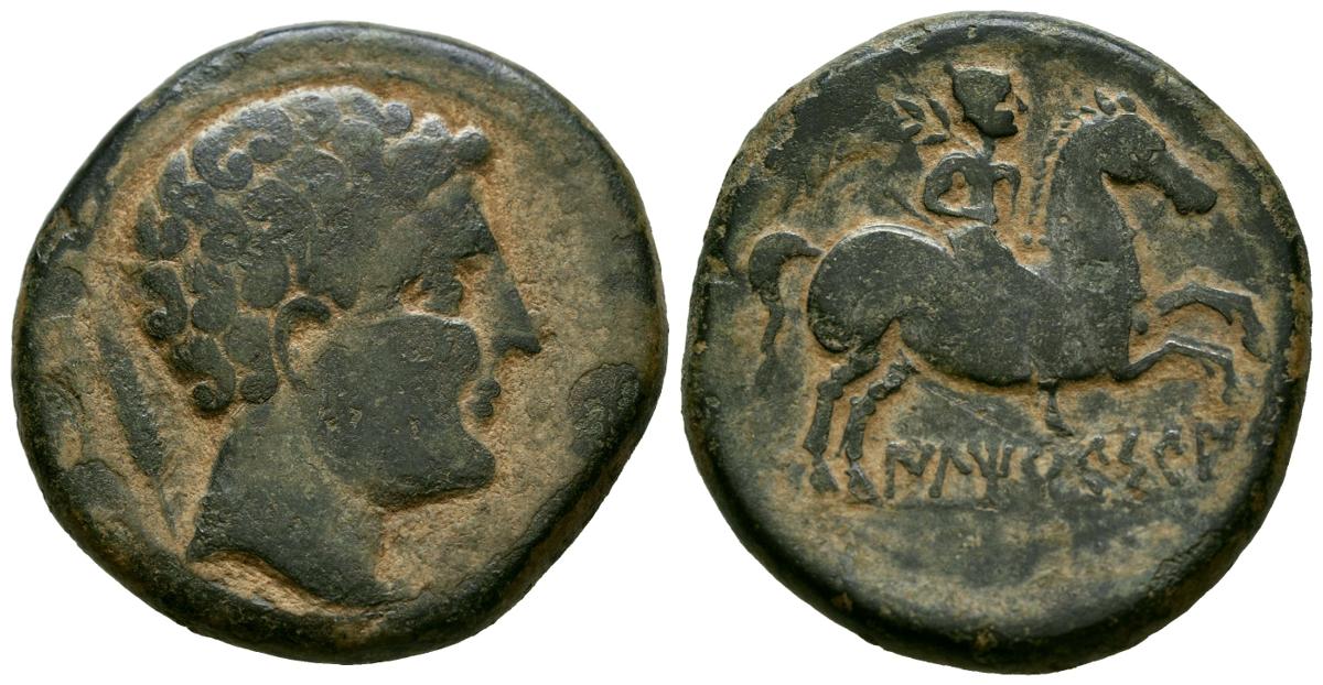 ILTIRCESCEN (Lérida). As. (Ae. 18,46g/30mm). 120-20 a.C. (FAB-1446). Anv: Cabeza masculina a derecha, detrás espiga. Rev: Jinete con palma a derecha, debajo leyenda: ILTIRCeSCeN. MBC-.