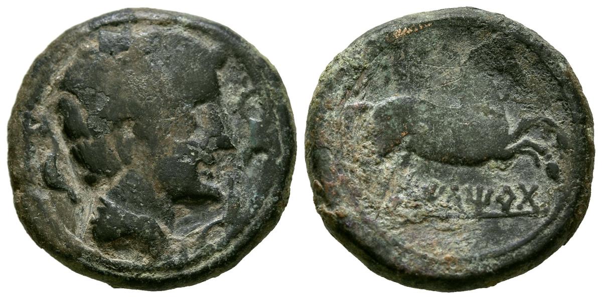 ILTIRTA (Lérida). Cuadrante. (Ae. 6,96g/21mm). 200-20 a.C. (FAB-1463). Anv: Cabeza masculina a derecha rodeada de tres delfines. Rev: Caballo a derecha, encima estrella, debajo leyenda: ILTiRTa. BC+.