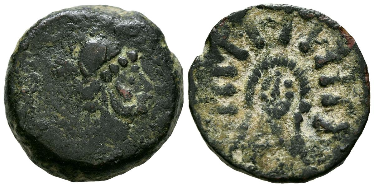 MALACA (Málaga). As. (Ae. 12,18g/23mm). 200-20 a.C. (FAB-1728). Anv: Cabeza de Vulcano a derecha, detrás tenazas. Rev: Cabeza de Helios de frente. MBC-.