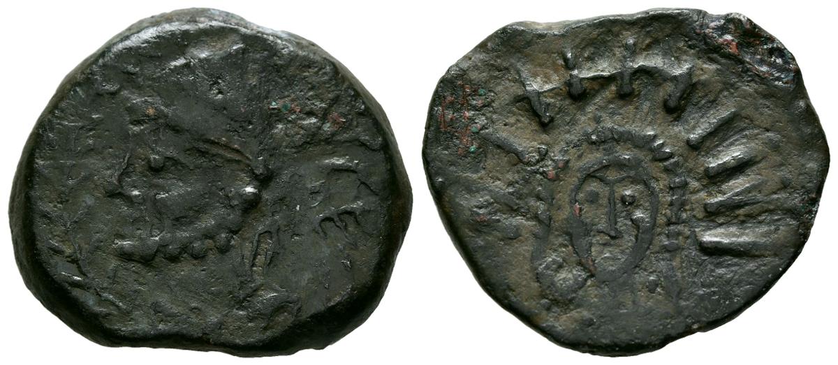 MALACA (Málaga). As. (Ae. 10,48g/26mm). 200-20 a.C. (FAB-1730). Anv: Cabeza de Vulcano a izquierda, detrás tenaza y leyenda. Rev: Cabeza de Helios de frente. MBC.