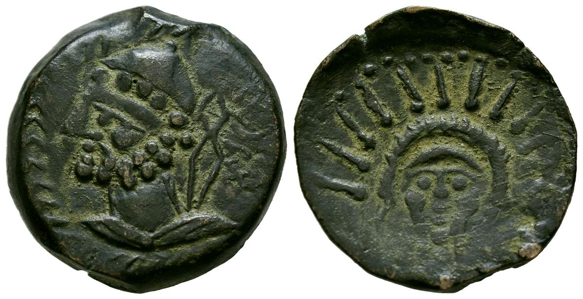 MALACA (Málaga). As. (Ae. 12,16g/25mm). 200-20 a.C. (FAB-1730). Anv: Cabeza de Vulcano a izquierda, detrás tenaza y leyenda. Rev: Cabeza de Helios de frente. MBC.