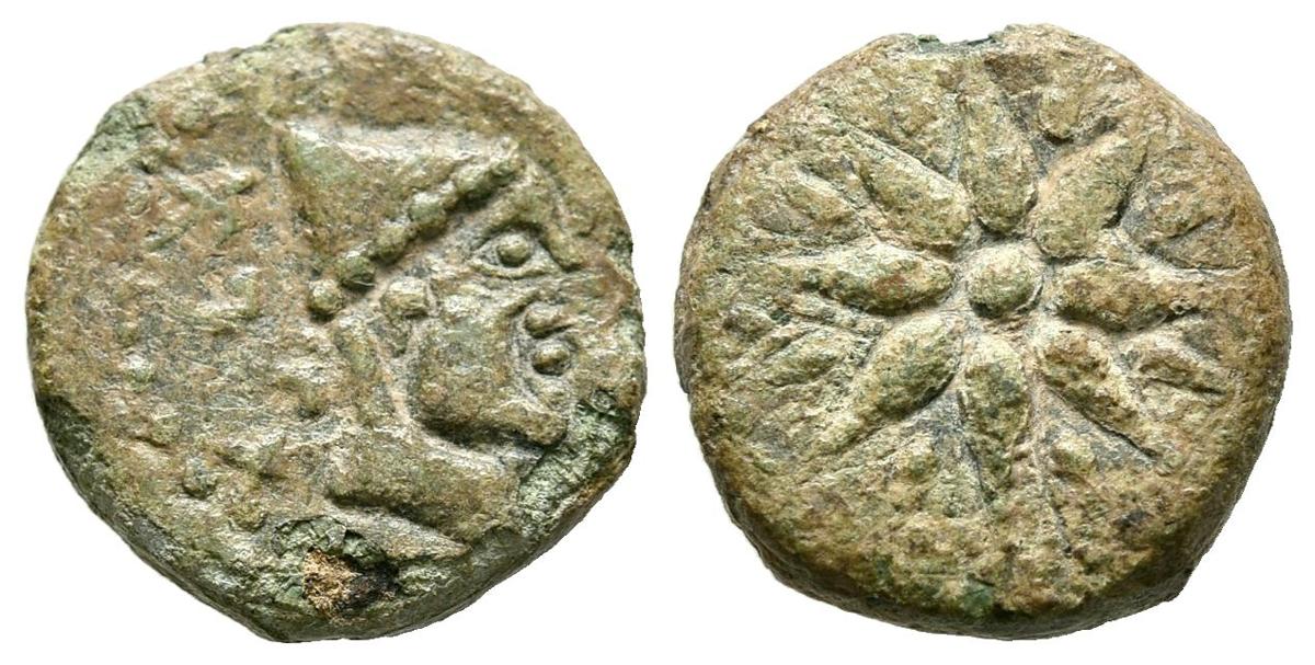 MALACA (Málaga). Sextante. (Ae. 1,79g/13mm). 200-20 a.C. (FAB-1744). Anv: Cabeza de Vulcano a derecha, detrás leyenda púnica tipo A. Rev: Estrella de ocho rayos. MBC.