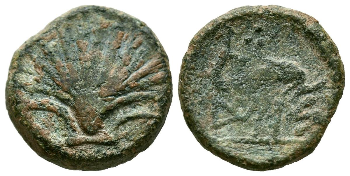 ARSE-SAGUNTO (Sagunto, Valencia). Cuadrante. (Ae. 3,97g/17mm). 170-20 a.C. (FAB-2051). Anv: Concha. Rev: Delfín, encima tres puntos, debajo leyenda ibérica: AIUBaS. MBC.