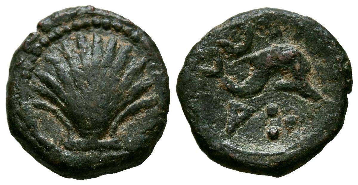 ARSE-SAGUNTO (Sagunto, Valencia). Cuadrante. (Ae. 2,47g/16mm). 170-20 a.C. (FAB-2054). Anv: Concha. Rev: Delfín a derecha, encima creciente, debajo letra ibérica A y tres puntos. MBC.