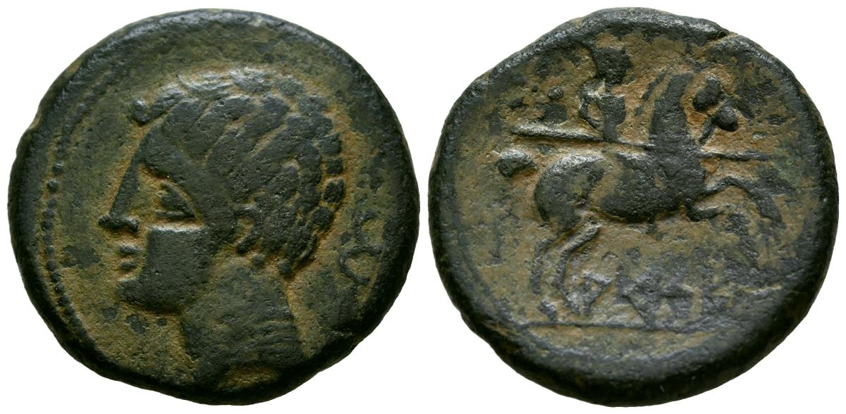 ARSE-SAGUNTO (Sagunto, Valencia). As. (Ae. 14,00g/28mm). 120-100 a.C. (FAB-2073). Anv: Cabeza diademada masculina a derecha, detrás caduceo. Rev: Jinete con lanza a derecha, encima estrella, debajo leyenda ibérica: ARSE. MBC. Escaso ejemplar.