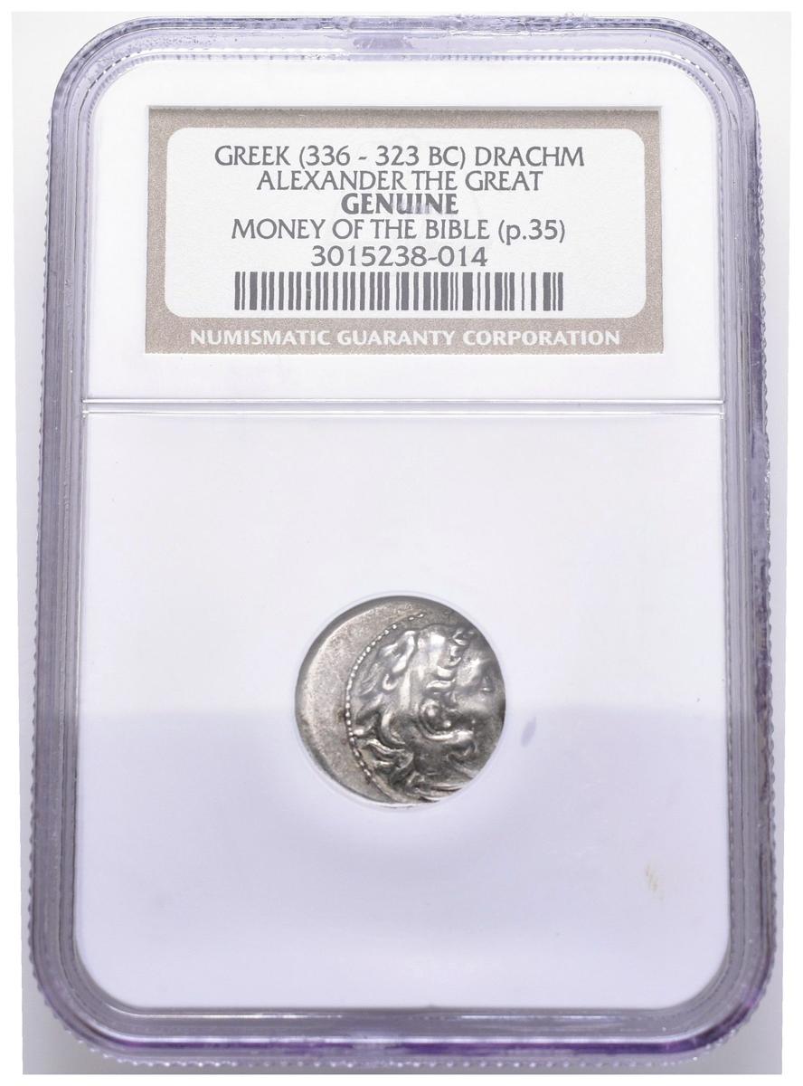 REYES DE MACEDONIA, Alejandro III el Grande. Dracma. 336-325 a.C. Lampsakos. (Price 1406). Anv: Cabeza de Hércules con piel de león a derecha. Rev: Zeus sentado a izquierda portando águila y cetro, delante monograma: KI, debajo del trono monograma ME, detrás leyenda griega. MBC+. Descentrada. Encapsulada por NGC Genuine.