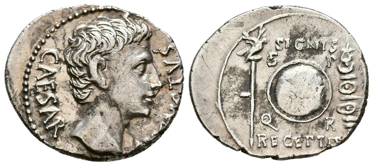 AUGUSTO. Denario. (Ar. 3,88g/15mm). 19 a.C. Colonia Patricia. (RIC 87a). Anv: Cabeza de Augusto a derecha, alrededor leyenda: CAESAR AVGVSTVS. Rev: Escudo con inscripción: CL V, entre águila sobre lanza y estandarte, alrededor: S-P-Q-R, encima: SIGNIS, debajo: RECEPTIS. EBC/EBC-. Acuñación floja en reverso. Bonito ejemplar, escaso así.