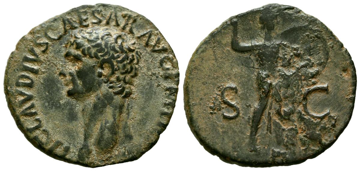 CLAUDIO I. As. (Ae. 8,00g/27mm). 41-50 d.C. Roma. (RIC 100). Anv: Cabeza de Claudio I a izquierda, alrededor leyenda: TI CLAVDIVS CAESAR AVG P M TR P IMP. Rev: Minerva avanzando a derecha portando lanza y escudo, entre S-C. MBC.