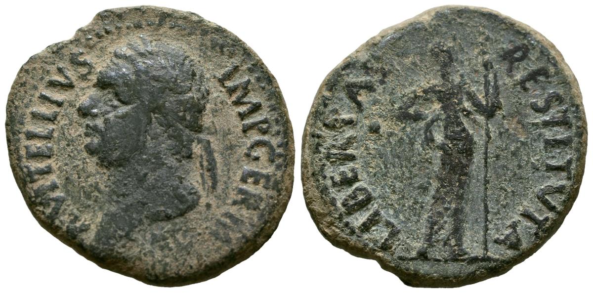 VITELIO. As. (Ae. 11,74g/30mm). 69 d.C. Tarraco. (Ae. 11,74g/29mm). Anv: Cabeza laureada de Vitelio a izquierda, alrededor leyenda: A VITELLIVS IMP GERMAN. Rev: Libertas estante a izquierda portando pileo y cetro, entre: S-C, alrededor leyenda: LIBERTAS RESTITVSTA. MBC-.