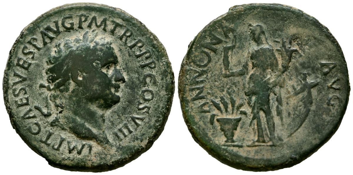 TITO. Sestercio. (Ae. 23,34g/36mm). 80 d.C. Roma. (RIC 86). Anv: Cabeza laureada de Tito a derecha, alrededor leyenda: IMP T CAES VESP AVG P M TR P P P COS VIII. Rev: Annona estante a izquierda portando cornucopia y Victoria, entre modio y proa, alrededor leyenda: ANNONA AVG. MBC-.
