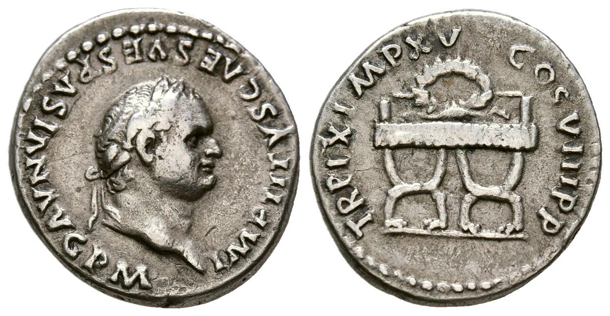 TITO. Denario. (Ar. 3,43g/18mm). 80 a.C. Roma. (RIC 108). Anv: Cabeza laureada de Tito a derecha, alrededor leyenda: IMP TITVS CAES VESPASIAN AVG P M. Rev: Silla curul, encima corona de laruel, alrededor leyenda: TR P IX IMP XV COS VIII P P. MBC+.