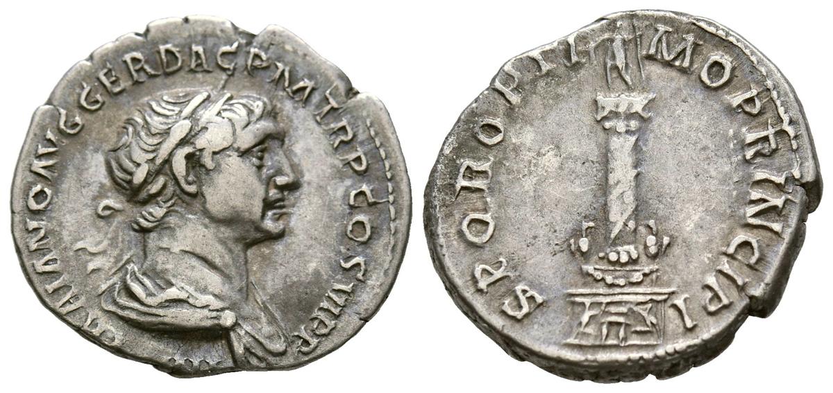 TRAJANO. Denario. (Ar. 3,29g/20mm). 114-117 d.C. Roma. (RIC 356). Anv: Busto laureado y drapeado de Trajano a derecha, alrededor leyenda: IMP CAES NER TRAIANO OPTIMO AVG GER DAC. Rev: Coulmna trajana coronada por estatua del emperador, alrededor leyenda: P M TR P COS VI P P SPQR. MBC+/MBC.