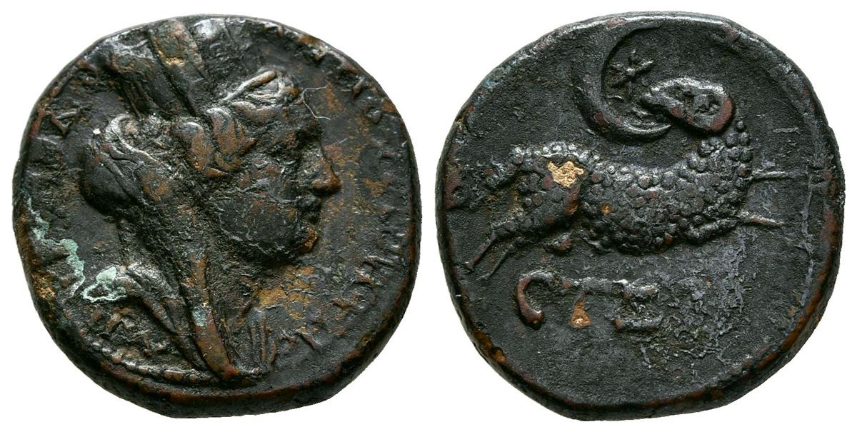 ADRIANO. Trichalkon. (Ae. 4,04g/17mm). 117-138 d.C. Siria, Seleucis y Pieria. (RPC 3730). Anv: busto drapeado de Tyche con corona mural, alrededor leyenda. Rev: Cabra saltando a derecha mirando a izquierda, en campo estrella y creciente, alrededor leyenda, MBC+.