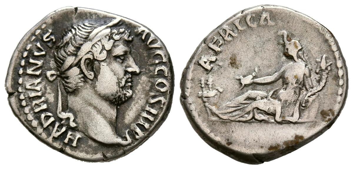 ADRIANO. Denario. (Ar. 3,59g/18mm). 130-133 d.C. Roma. (RIC 1494). Anv: Cabeza laureada de Adriano a derecha, alrededor leyenda: HADRIANVS AVG COS III P P. Rev: Africa tumbada a izquierda portando cornucopia y escorpión, a sus pies cesto de frutas, encima leyenda: AFRICA. MBC. Escaso ejemplar.