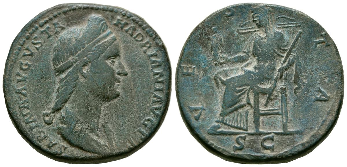 SABINA. Sestercio. (Ae. 25,96g/31mm). 128-136 d.C. Roma. (RIC 1036). Anv: Busto diademado y drapeado de Sabina a derecha, alrededor leyenda: SABINA AVGVSTA HADRIANI AVG P P. Rev: Vesta sentada a izquierda portando paladio y cetro, debajo: SC, alrededor leyenda: VESTA. MBC. Pátina verde.