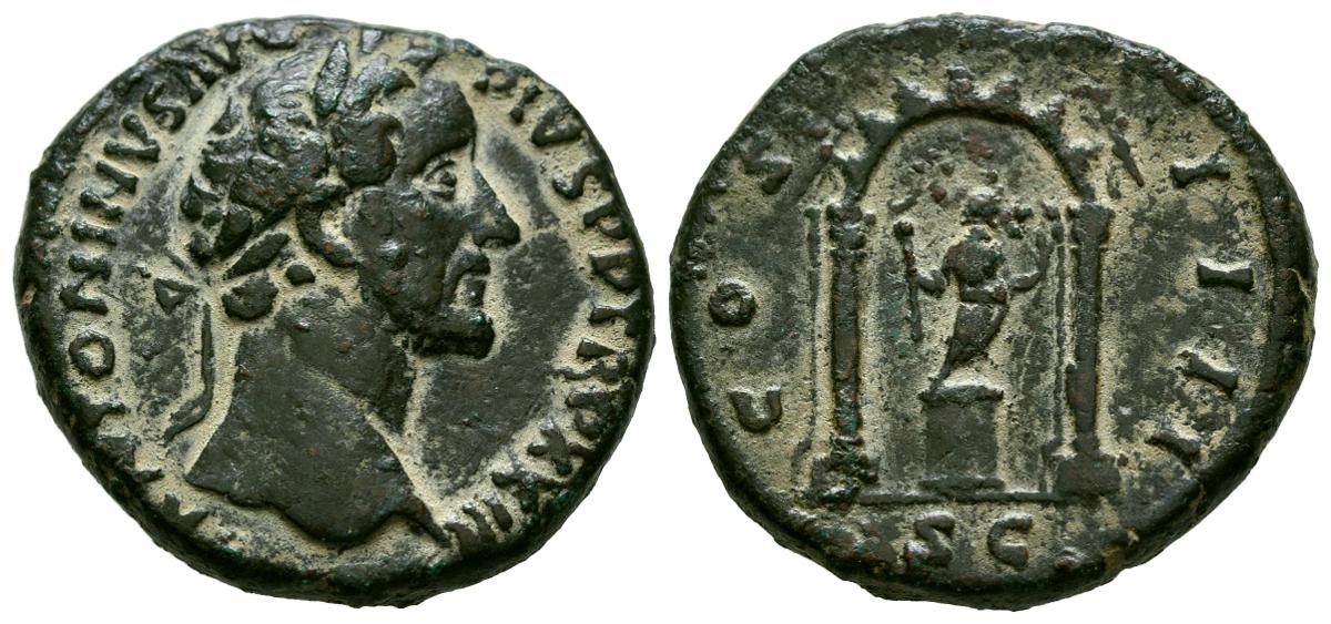 ANTONINO PIO. As. (Ae. 10,76g/25mm). 159-160 d.C. Roma. (RIC 1039). Anv: Cabeza laureada de Antonino Pío a derecha, alrededor leyenda: ANTONINVS AVG PIVS P P TR P XXIII. Rev: Figura estante bajo capilla sostenida por dos columnas, debajo SC, alrededor leyenda: COS IIII. MBC.
