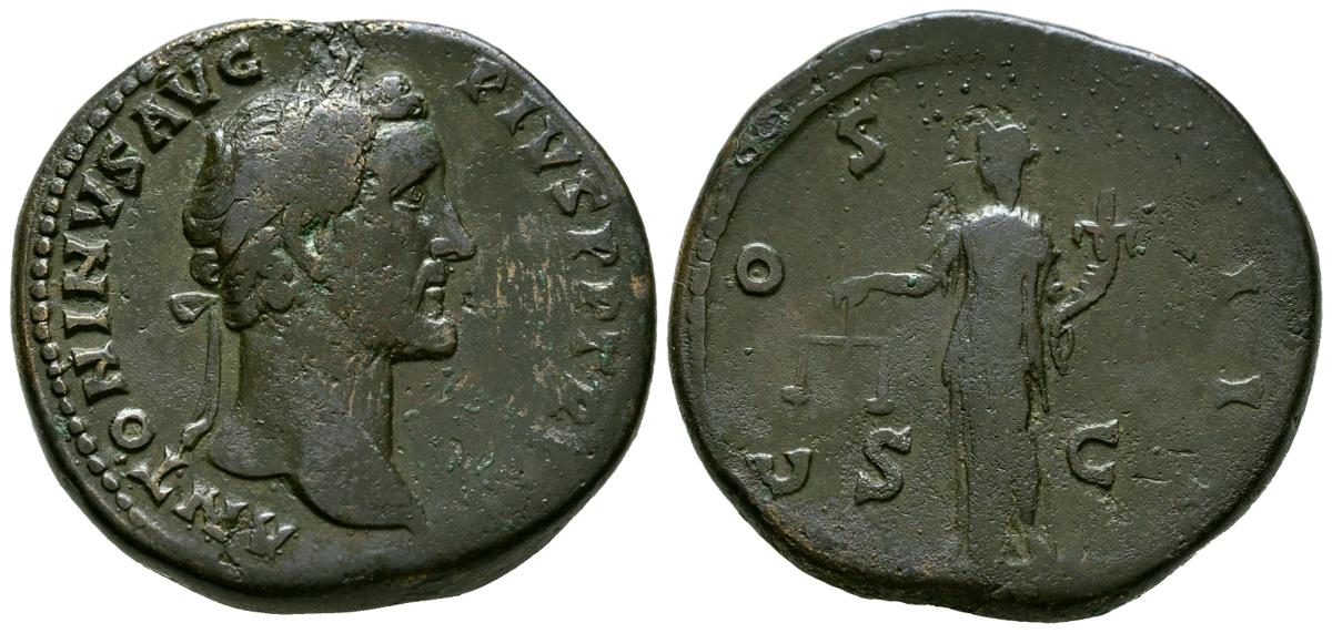 ANTONINO PIO. Sestercio. (Ae. 24,14g/32mm). 150-151 d.C. Roma. (RIC 886). Anv: Cabeza laureada de Antonino Pío a derecha, alrededor leyenda: ANTONINVS AVG PIVS P P TR P. Rev: Aequitas estante a izquierda portando escalas y cornucopia, entre: S-C, alrededor leyenda: COS IIII. MBC-.