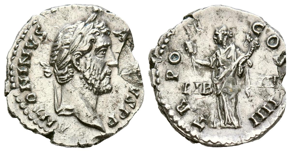ANTONINIANO PIO. Denario. (Ar. 3,02g/18mm). 145-161 d.C. Roma. (RIC 156). Anv: Cabeza laureada de Antonino Pío a derecha, alrededor leyenda: ANTONINVS AVG PIVS PP. Rev: Liberalitas estante a izquierda labarum y cornucopia, entre: LIB-IIII, alrededor leyenda: TR POT COS IIII. EBC. Hoja saltada.