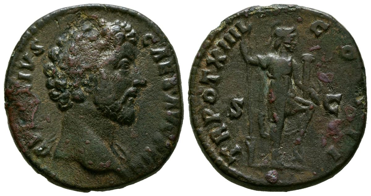 MARCO AURELIO. As. (Ae. 11,07g/25mm). 159-161 d.C. Roma. (RIC 1355). Anv: Cabeza de Marco Aurelio a derecha, alrededor leyenda: AVRELIVS CAES AVG PII F. Rev: Virtus estante a dercha portando lanza y parazonium, entre: S-C, alrededor leyenda: TR POT XIIII COS II. MBC-. Oxidaciones limpiadas.