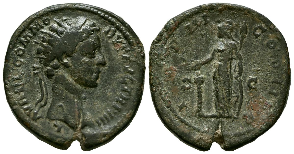 COMODO. Dupondio. (Ae. 9,84g/27mm). 179 d.C. Roma. (RIC 1604). Anv: Cabeza radiada de Cómodo a derecha, alrededor leyenda: L AVREL COMMODVS AVG TR P IIII. Rev: Minerva estante a izquierda portando lanza y escudo y tirando incienso sobre altar, entre: S-C, alrededor leyenda: IMP III COS II P P. MBC.