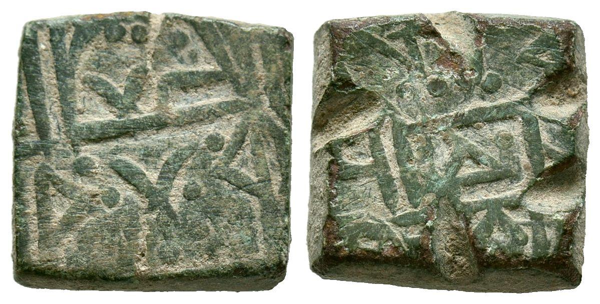 Ponderal de dinar de al-Andalus. (Ae. 3,66g/12mm). Leyenda invertida: La Justicia es de Dios, en ambas caras. (Ibrahim tipo B). MBC+. Marcas de ajuste de peso en una de sus áreas.