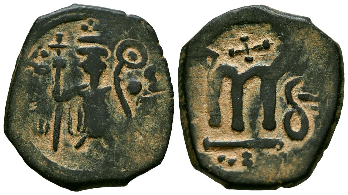 ACUÑACION ARABE-BIZANTINA. Fals. (Ae. 7,10g/25mm). 680-710 d.C. Ceca 'Pseudo-Damasco', probablemente en el norte de Jordania o Palestina. (Album 3522.1). Anv: Figura imperial de pie, sosteniendo una cruz larga y un globo cruciger, a la izquierda, pájaro alto de pie a la derecha, rama a la derecha. Rev: M grande, cruz arriba, líneas onduladas alrededor. BC+.