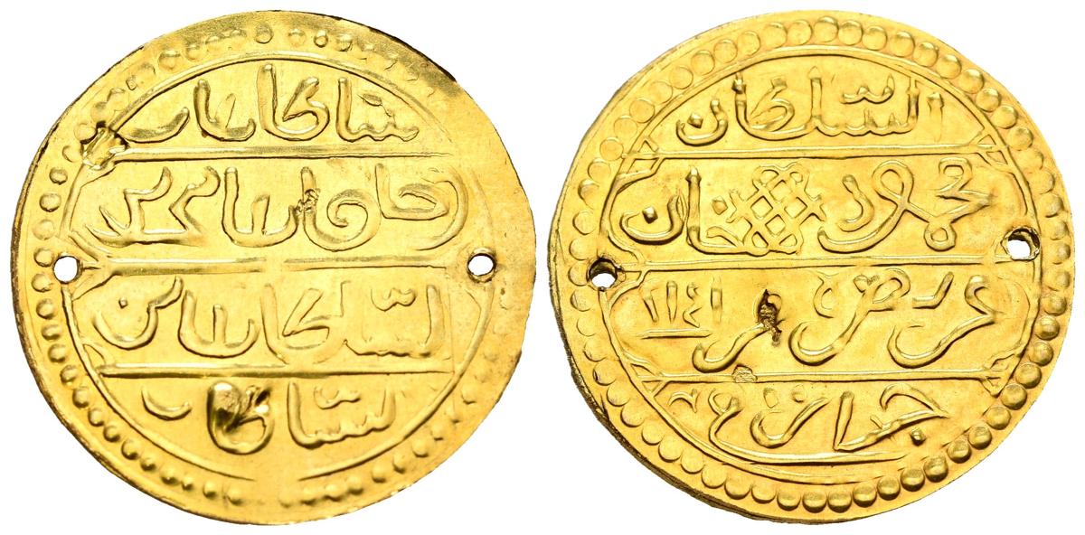 IMPERIO OTOMANO, Mahmud I (1143-1168H). Sultani. (Au. 3,97g/25mm). 1143H. Jazair (Argelia). EBC+. Reproducciòn de joyerìa en oro puro. Dos perforaciones.