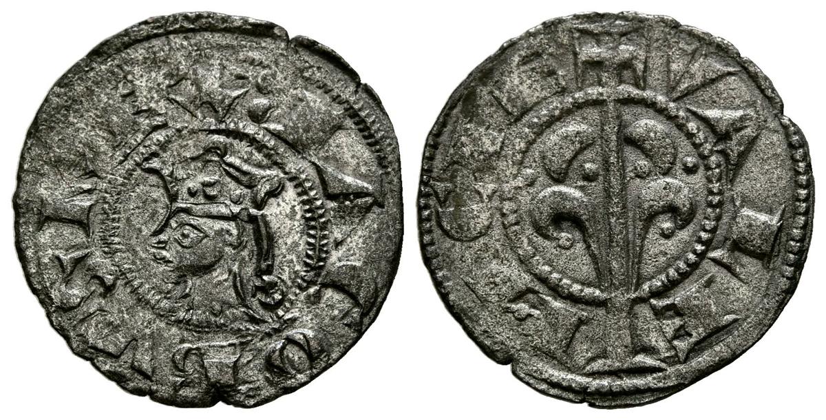 JAIME I (1213-1276). Dinero. (Ve. 0,60g/16mm). Valencia. (Cru.V.S. 316). Anv: Busto coronado de Jaime I a izquierda dentro de gráfila, alrededor leyenda: IACOBVS REX. Rev: Arbol con las ramas bajas dentro de gráfila, alrededor leyenda: VALENCIE. MBC+/MBC. Bonita pátina.