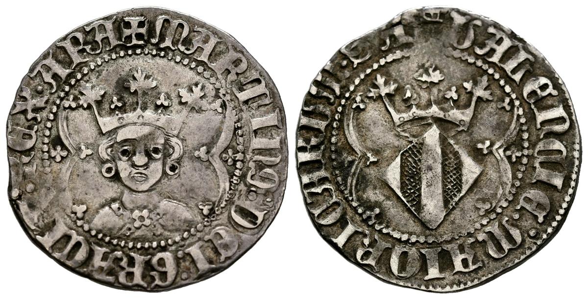 MARTI I (1396-1410). 1 Real. (Ar. 3,32g/24mm). Valencia. (Cru V.S. 527.1). Anv: Busto coronado de Marti I a derecha dentro de gráfila lobulada, alrededor leyenda: MARTIN DEI GRACIA ARA REX. Rev: Armas coronadas de Valencia dentro de gráfila lobulada, alrededor leyenda: VALENCIE MAIORICARVM SAR. MBC+.