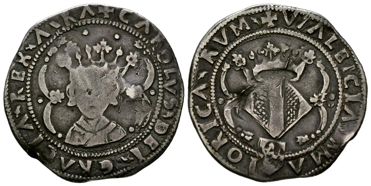 CARLOS I (1516-1556). 2 Reales. (Ar. 5,07g/28mm). S/D. Valencia. (Cal-2019-90). MBC-. Vano de acuñación en anverso.