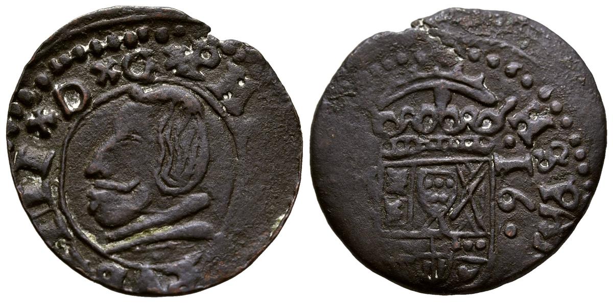 FELIPE IV (1621-1665). 16 Maravedís. (Ae. 3,82g/25mm). Fecha no visible. Probablemente se trate de la ceca de Madrid a tenor de su busto. Falsa de época. MBC+. Escaso ejemplar con el busto a izquierda.
