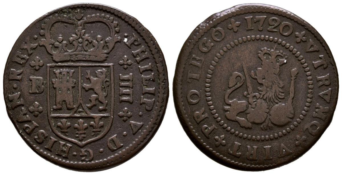 FELIPE V (1700-1746). 4 Maravedís. (Ae. 9,12g/27mm). 1720. Barcelona. (Cal-2019-84). MBC.