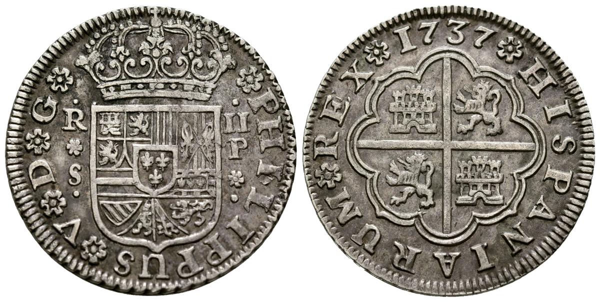 FELIPE V (1700-1746). 2 Reales. (Ar. 5,85g/27mm). 1737. Sevilla P. (Cal-2019-997).  MBC+. Preciosa pátina.