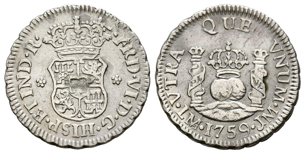 FERNANDO VI (1746-1759). 1/2 Real. (Ar. 1,63g/16mm). 1759. Lima JM. (Cal-2019-63). MBC+. Sin punto sobre la marca de ceca. Escasa y más así.
