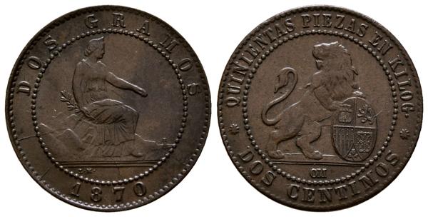 GOBIERNO PROVISIONAL (1868-1871). 2 Céntimos. (Ae. 2,03g/20mm). 1870. Barcelona. (Cal-2019-4). SC-. Bonito ejemplar.