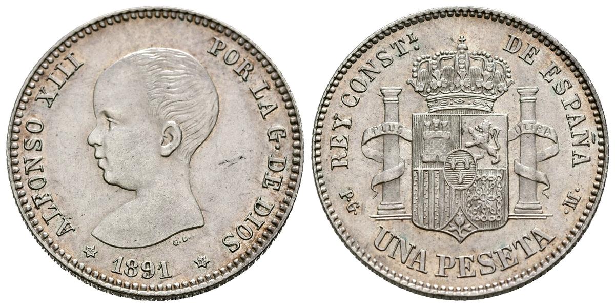 ALFONSO XIII (1885-1931). 1 Peseta. (Ar. 5,02g/23mm). 1891 *18-91. Madrid PGM. (Cal-2019-53). EBC. Precioso ejemplar con una bonita pátina irisada y restos de brillo original, escaso así.