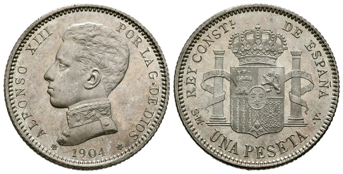 ALFONSO XIII (1885-1931). 1 peseta. (Ar. 4,97g/23mm). 1904* 19-04. Madrid SMV. (Cal-2019-68). SC-. Brillo original.