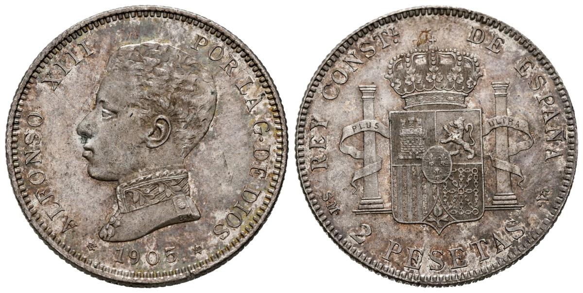 ALFONSO XIII (1885-1931). 2 Pesetas. (Ar. 10,07g/27mm). 1905 *19-05. Madrid SMV. (Cal-2019-88). EBC. Preciosa pátina y brillo.