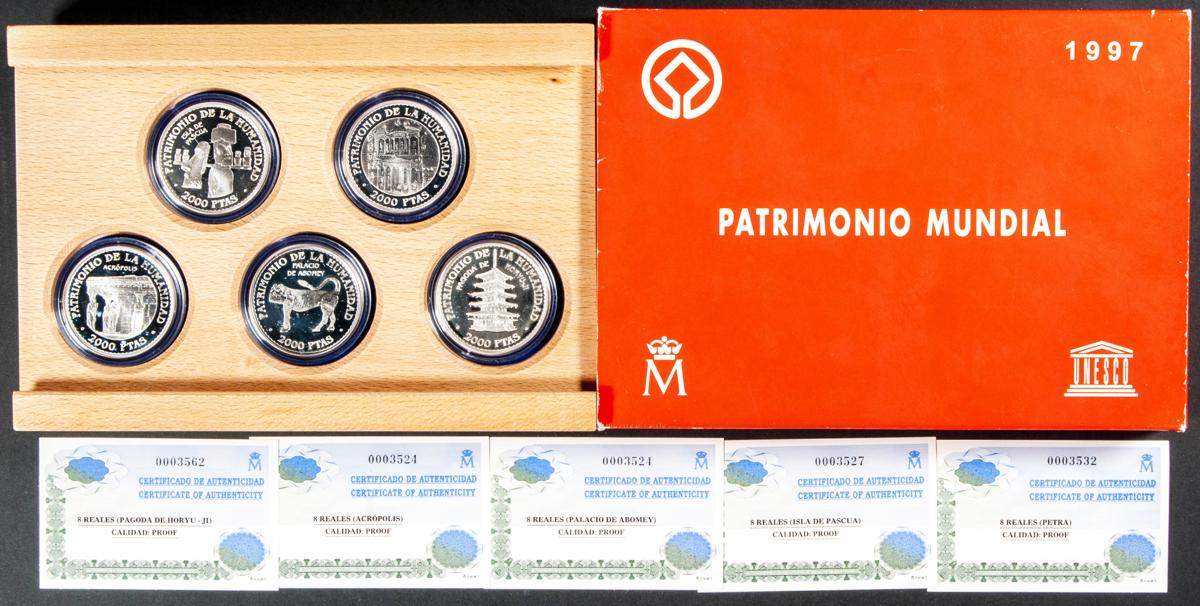 JUAN CARLOS I (1975-2014). Estuche formado por 5 monedas de 2000 Pesetas. Patrimonio Mundial de la UNESCO. 1997. FNMT. Peso y medida teóricos por monedas: 27,00g/40mm. Incluye estuche original en madera y certificados de autenticidad. Plata de 0,925 milésimas. PROOF.