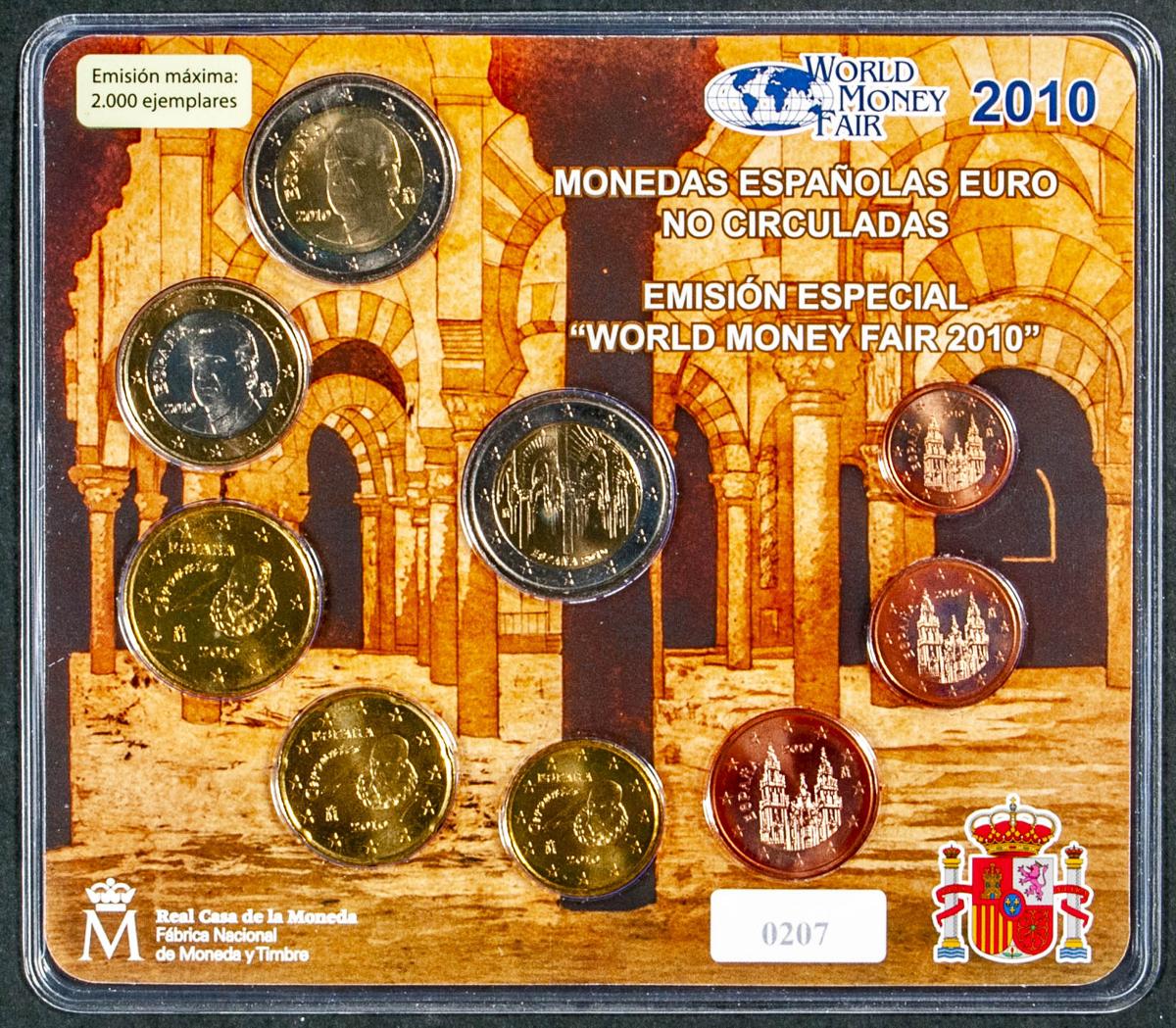 JUAN CARLOS I (1975-2014). Cartera oficial con 9 valores (incluye moneda conmemorativa de 2 Euros de la Mezquita de Córdoba, primera moneda de la serie de Patrimonio Universal de la Unesco) del año 2010. SC. Edición especial de la World Money Fair. Tirada de 2 mil ejemplares.