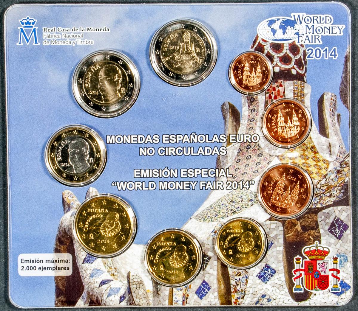 JUAN CARLOS I (1975-2014). Cartera oficial con 9 valores (incluye moneda conmemorativa de 2 Euros del Parque Güel de Gaudí de la serie de Patrimonio Universal de la Unesco) del año 2014. SC. Edición especial de la World Money Fair Tirada de 2 mil ejemplares.
