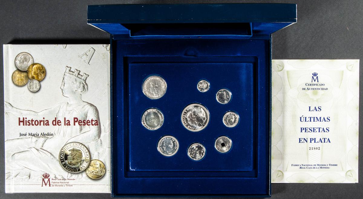 JUAN CARLOS I (1975-2014). Serie completa conmemorativa de Las Últimas Pesetas en Plata. Valores comprendidos entre 1 y 2000 Pesetas. 2000-2001. FNMT. PROOF. Presentadas en estuche oficial, incluyendo certificado y libro de Jose María Aledón: "Historia de la Peseta".