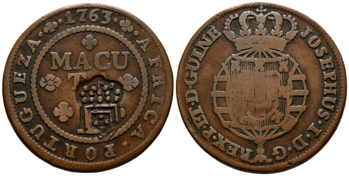 ANGOLA (Portuguesa), José I. 1 Macuta. (Ae. 34,58g/43mm). 1763. Resello bajo el reinado de María II (1834-1853). (Gomes 05.02). MBC.