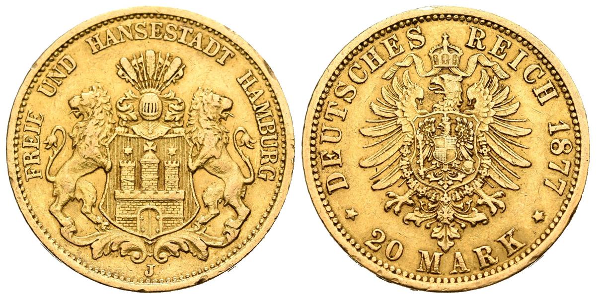 ALEMANIA. 20 Mark. (Au. 7,93g/23mm). 1877. Ciudad Libre y Hanseática de Hamburgo. J. (Km#602). MBC+.