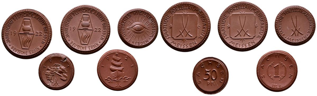 ALEMANIA. Conjunto de 5 piezas en porcelana marrón (3 medallas y 2 monedas, de 50 Pfennig y 1 Mark) acuñadas entre 1921 y 1922 durante la República de Weimar. Diferentes estados de conservación. A EXAMINAR