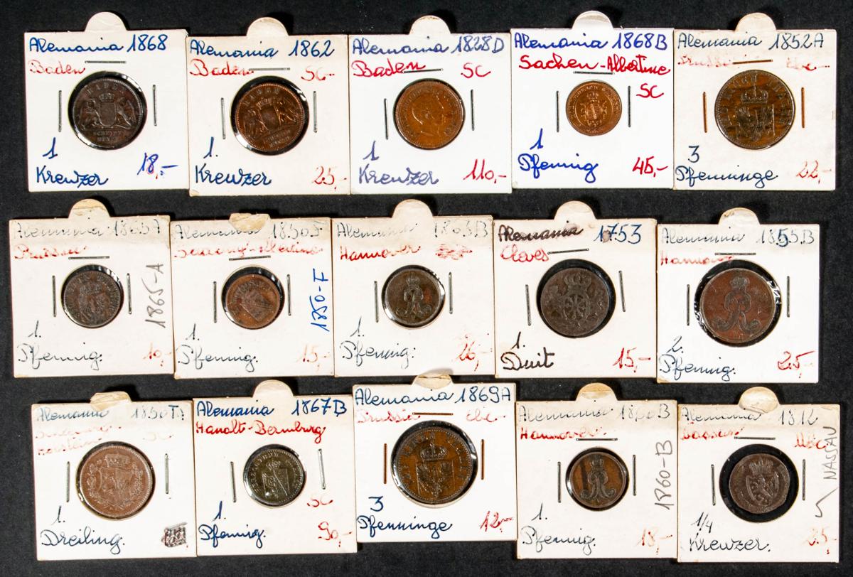 ALEMANIA. Bonito e interesante conjunto de 15 cobres acuñados entre 1753 y 1869 en diferentes estados alemanes, con variedad de módulos, cecas y fechas. Alto nivel de conservación en general. A EXAMINAR