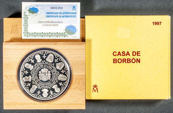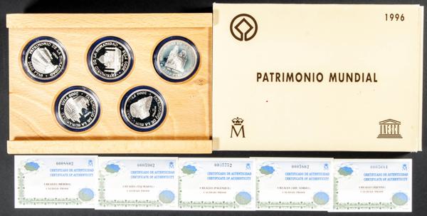 JUAN CARLOS I (1975-2014). Estuche formado por 5 monedas de 2000 Pesetas. Patrimonio Mundial de la UNESCO. 1996. FNMT. Peso y medida teóricos por monedas: 27,00g/40mm. Incluye estuche original en madera y certificados de autenticidad. Plata de 0,925 milésimas. PROOF.